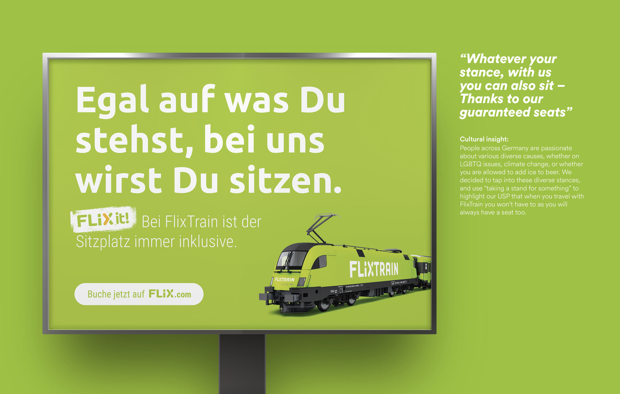 We won the pitch to launch FlixBus’s new train service across Germany. Flix operates on key routes, at much cheaper than national carrier Deutsche Bahn. Alongside the price, the key selling point is that your ticket guarantees a seat.